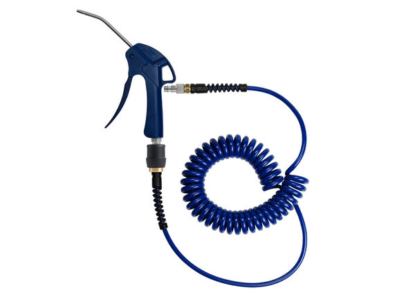 Kit pronto all'uso, senza bisogno di avvitare il tubo all'impianto compressore. La connessione all'aria compressa avviene tramite un innesto rapido. È costituito da un tubo spiralato inpoliuretano 95 Shore assemblato con una pistola di soffiaggio con innesto, attacco rapido di sicurezza AT240 e innesto. Se non si dispone di un attacco rapido sull'impianto, è possibile richiederne uno aggiuntivo.