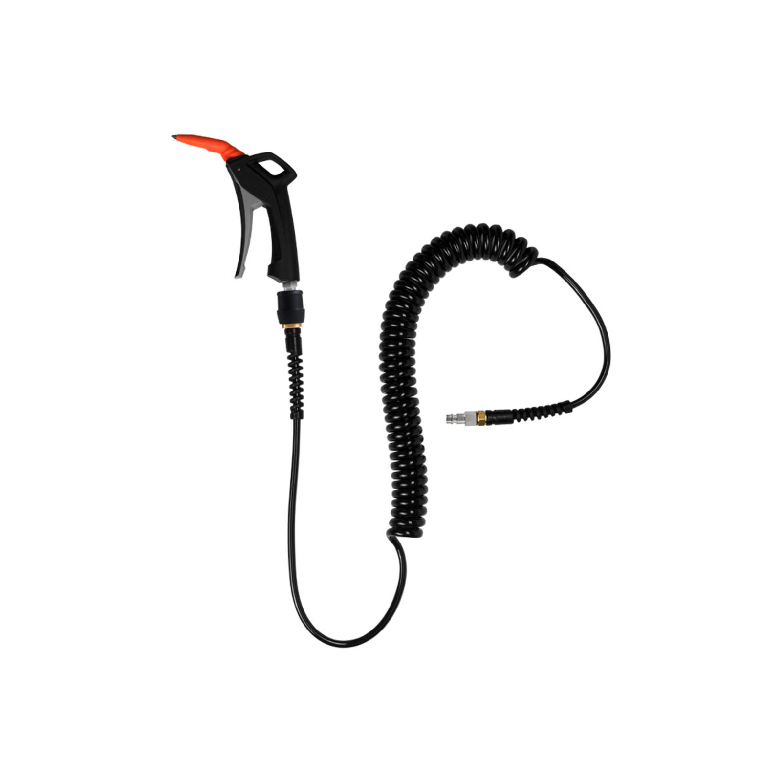 Kit pronto all'uso, senza bisogno di avvitare il tubo all'impianto compressore. La connessione all'aria compressa avviene tramite un innesto rapido. È costituito da un tubo spiralato inpoliuretano 95 Shore assemblato con una pistola di soffiaggio con innesto, attacco rapido di sicurezza AT240 e innesto. Se non si dispone di un attacco rapido sull'impianto, è possibile richiederne uno aggiuntivo.