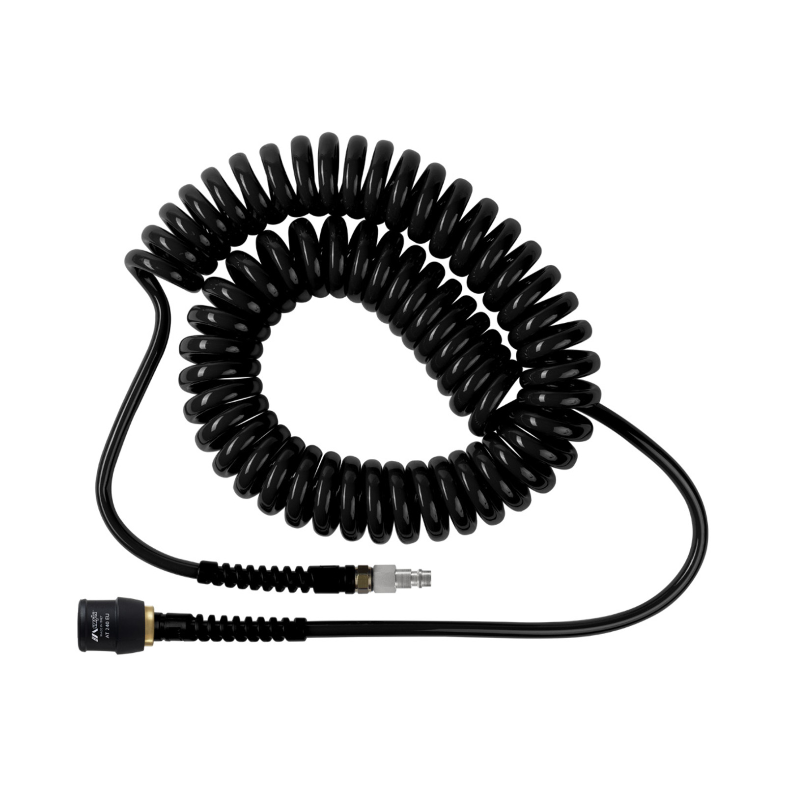 Pronto all'uso, non richiede di avvitare il tubo all'impianto o al compressore. La connessione avviene tramite un innesto rapido. Il kit comprende un tubo spiralato in poliuretano 95 Shore, assemblato con attacco rapido AT 240 e innesto.